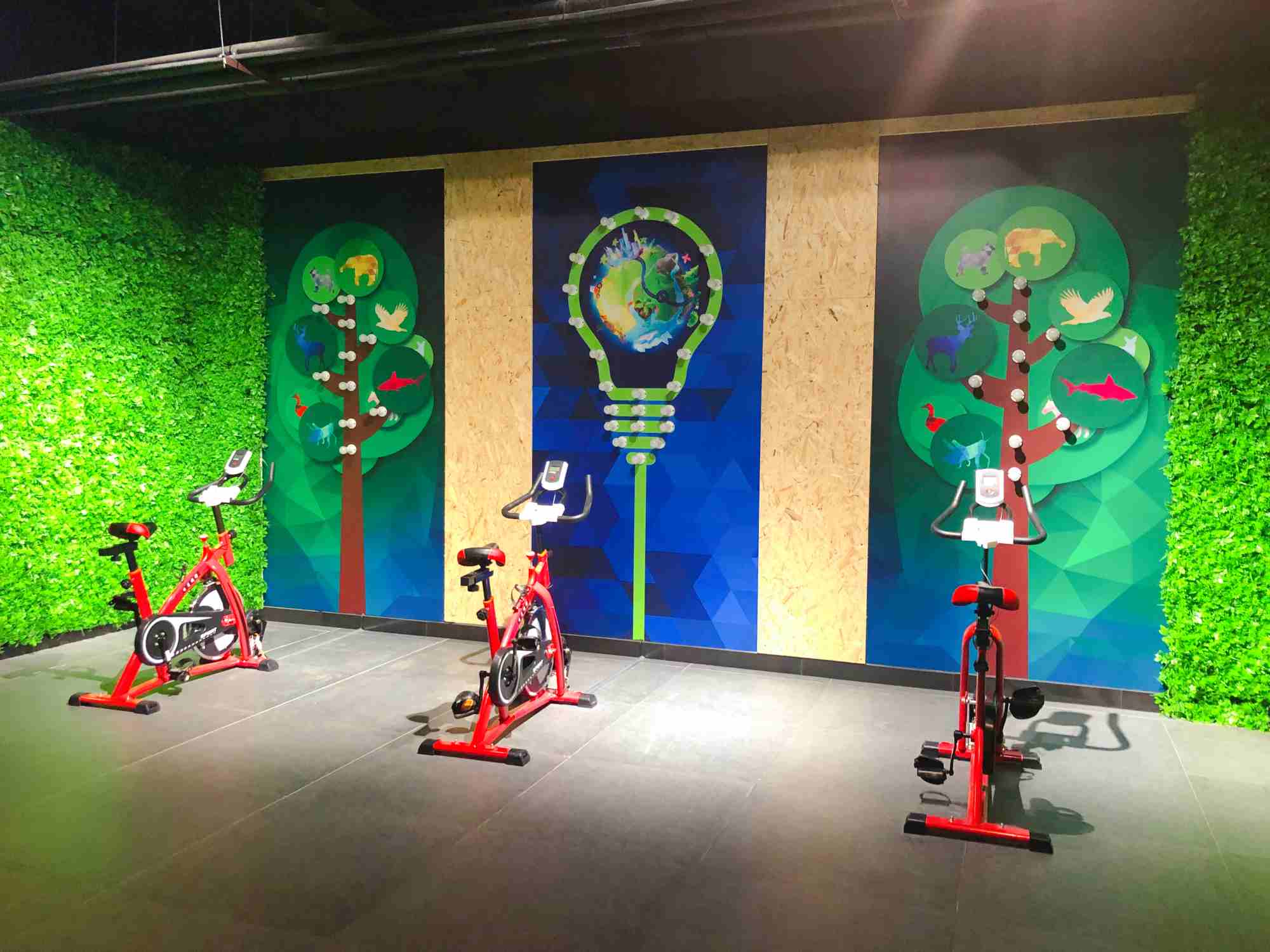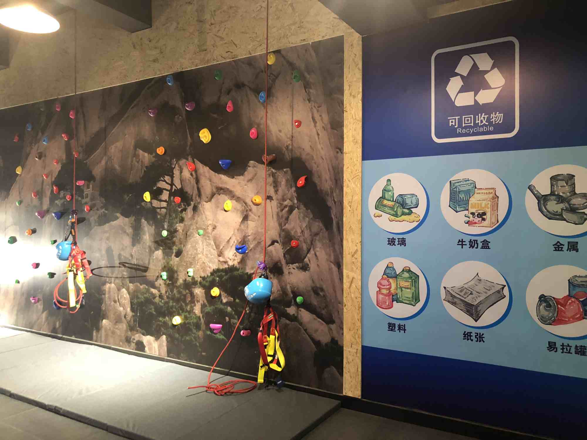 五層環(huán)保樂園,是環(huán)保教育基地的一個(gè)游戲體驗(yàn)區(qū),總共有五個(gè)游戲體驗(yàn)項(xiàng)目。分別是:1、“自行車發(fā)電體驗(yàn)”,體驗(yàn)者腳踏自行車通過人工動(dòng)能進(jìn)行發(fā)電,點(diǎn)亮燈泡,倡導(dǎo)綠色出行理念;2、“模擬娃娃機(jī)”,此項(xiàng)目通過投影將垃圾倉中垃圾抓斗的工作的視頻投影在墻上,體驗(yàn)者通過娃娃機(jī)模擬抓垃圾的過程,提高在生活中盡量減少垃圾的產(chǎn)生的意識(shí);3、“分類能手大比拼”,體驗(yàn)者通過道具求砸中游戲墻上所規(guī)定的垃圾類別,將垃圾分類知識(shí)深入人心;4、“攀巖體驗(yàn)”,體驗(yàn)者模擬黃山放繩工攀巖山間拾撿飄落垃圾的的過程,目的是告誡大家在旅游過程中不要亂丟垃圾;5、“負(fù)重體驗(yàn)”,體驗(yàn)者模擬黃山挑山工日運(yùn)百斤垃圾的負(fù)重之旅。意在使參觀者體會(huì)環(huán)衛(wèi)工的辛苦,呼吁大家從身邊的一點(diǎn)一滴做起,愛護(hù)環(huán)境,保護(hù)我們的地球家園。