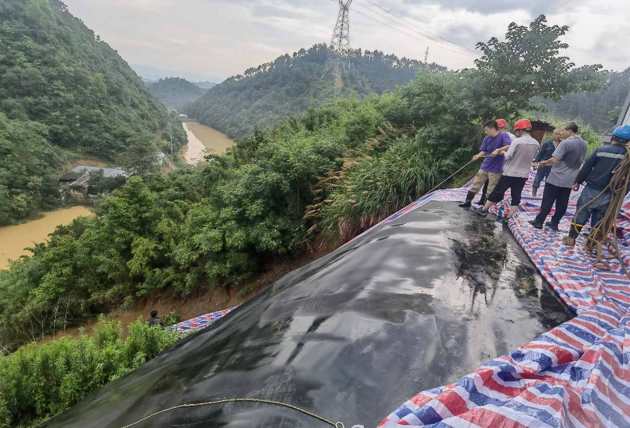不畏艱險,砥礪前行。廠區(qū)內(nèi)市屬飛灰暫存庫東南角發(fā)生山體滑坡,根據(jù)地質(zhì)專家的建議,需要采取覆膜護坡的應(yīng)急方案。生產(chǎn)技術(shù)部部長助理宋文潔同志帶領(lǐng)維保單位不畏艱險、主動請纓,冒雨沿著安全繩深入30余米的坡底進行連續(xù)覆膜作業(yè),完工時幾近虛脫,受到在場主管部門領(lǐng)導(dǎo)和地質(zhì)單位專家的一致稱贊,為公司贏得了嘉譽。